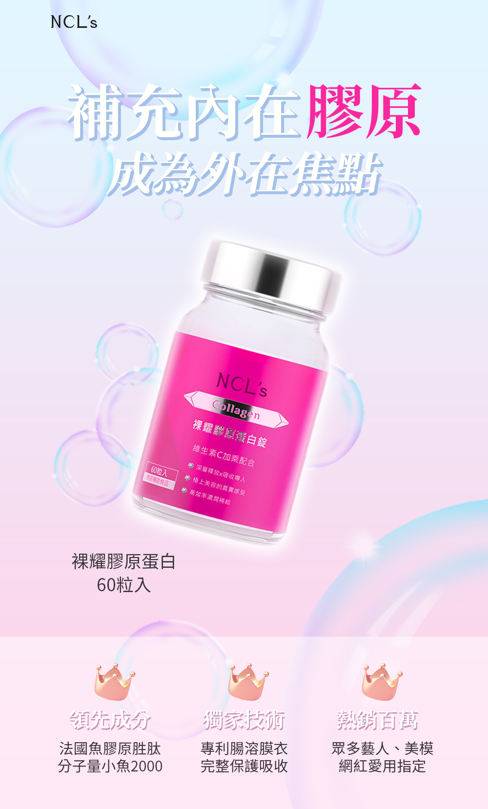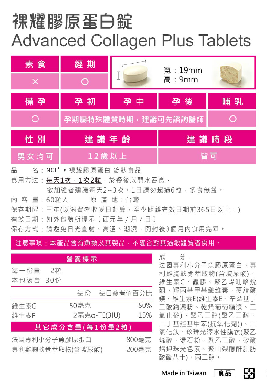 裸耀膠原蛋白錠 簡介裸耀膠原蛋白錠 功效介紹✓ 小分子膠原胜肽:深層補充彈力因子✓ 玻尿酸:高倍吸水,基底澎潤✓ 維生素C:具抗氧化作用,促進膠原白形成裸耀膠原蛋白錠 推薦✓ 法國大廠專利Naticol®魚膠原蛋白✓ 低溫水解技術,小分子膠原胜肽✓ 高作用性,高吸收率✓ 專利耐胃酸膜衣技術,完整吸收不怕破壞✓ 甜美女神林莎愛用代言推薦,讓美麗再升級!年紀增長,膠原蛋白逐漸流失,強力推薦給希望保持Q彈水潤的你!方便有效率、快速滋補,隨時水水、美美,愛上素顏的自己!